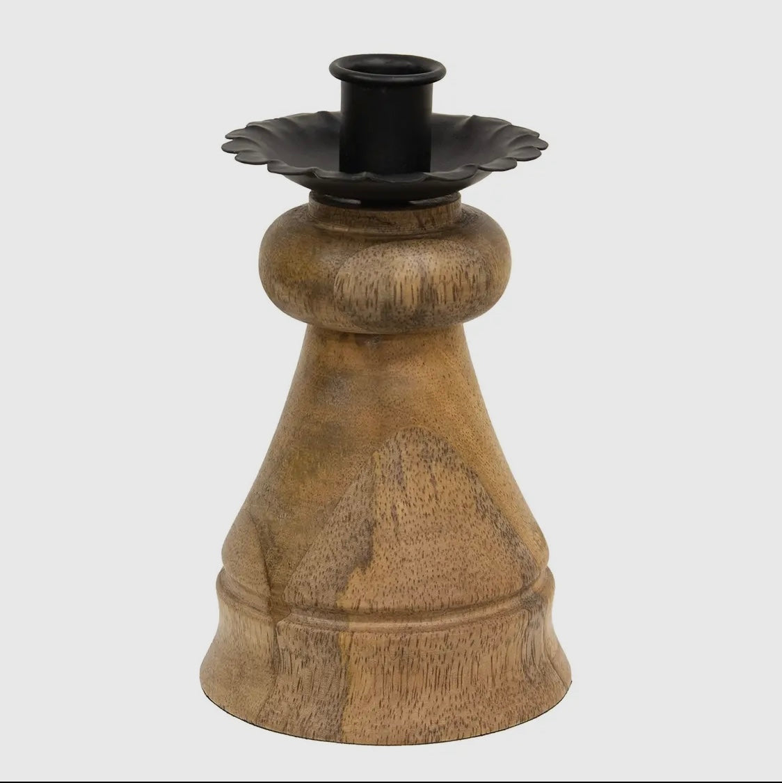 The Natural Wood & Metal Spindle Taper Holder is a unique candleholder made with farmhouse-inspired style. The body of the taper holder is carved from wood with a natural finish for a rustic look. A metal candle cup tops the taper holder. Measures 6.25” high by 3.75” in diameter.