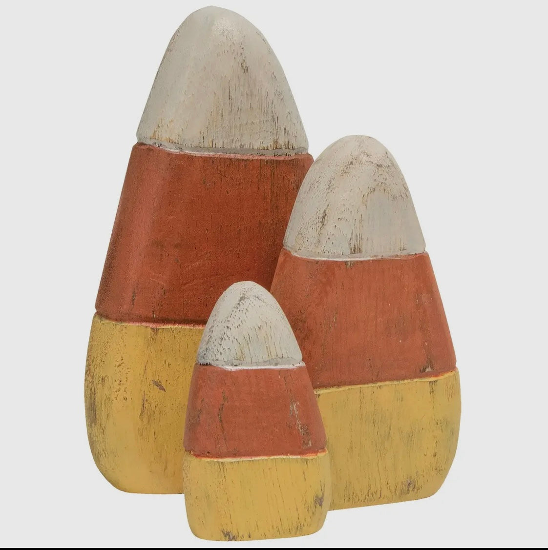 Wooden Candy Corn sell as a set of three wooden candy corn table sitters that look so cute displayed around fall and Halloween! Each piece is painted in a distressed, traditional white, orange, and yellow color scheme. Candy corn is freestanding and looks great displayed on a small table or shelf. Pieces measure 3" high by 1.5" wide, 4.75" high by 2.75" wide, and 5.75" high by 3.5" wide.